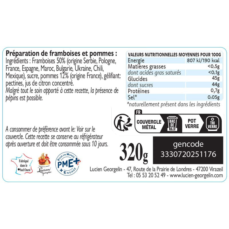 ingredients: raspberries* 50%, sugar, apples* 12%, gelling: pectins, concentrated lemon juice. Raspberry of Serbia origin, Poland, France, Spain * Original Apple France